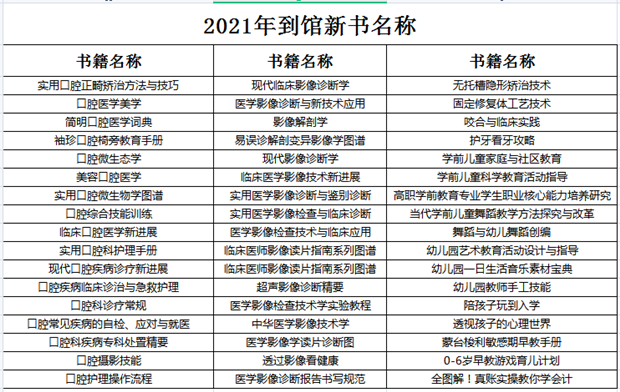 为满足师生教学需求,补充学校新增专业、招生人数较多专业的学习用书,图书馆2020年底购买了一批新书,主要包括口腔医学、医学影像学、学前教育、会计学等专业相关图书353册,现在已经全部到馆,图书馆工作人员已清点,完成上架,新到图书目录在云南工程职业学院图书馆网站和图书馆公示栏公布。欢迎广大读者来馆浏览借阅,享受阅读乐趣!
