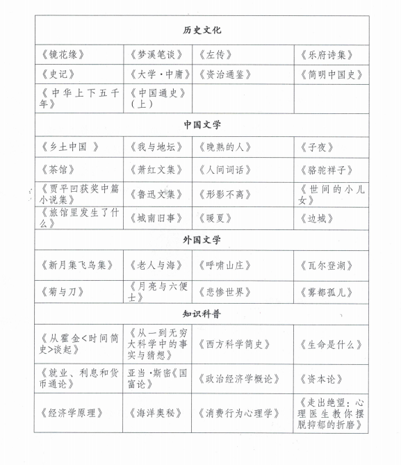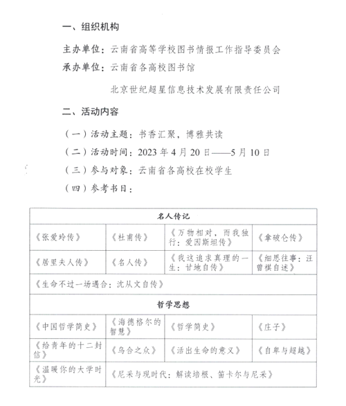 云南省高等学校图书情报工作指导委员会举办的“经典阅读积分大赛—‘书香汇聚 博雅共读’活动”开始了,时间从2023年4月20日—5月10日。学校教务处图书馆邀请全校学生积极参加比赛。一共有70本好书推荐阅读(见通知)。