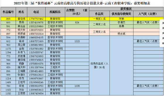 在学校教务处图书馆、就业创业工作处和各二级学院大力支持下,2022年第三届“软件通杯”云南省高职高专简历设计技能大赛中,学校共377名同学参赛,分别荣获一等奖1项,二等奖2项,三等奖2项,优秀指导老师4位,优秀组织奖1项,最佳人气奖8项等,获奖数量和质量居云南省民办高职高专院校第一。