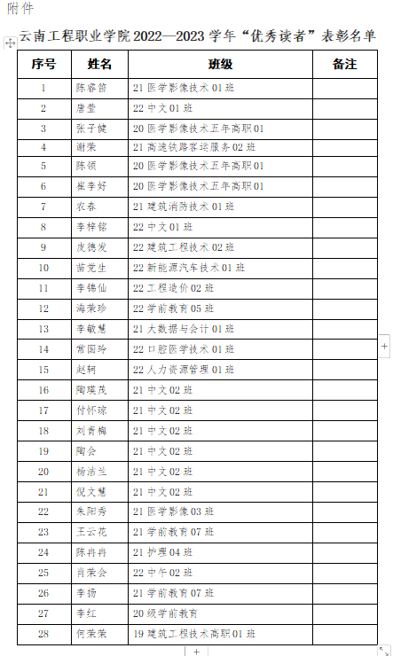 附件:云南工程职业学院2022-2023学年“优秀读者”表彰名单