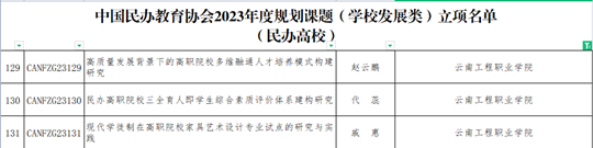经中国民办教育协会组织专家线下集中评审,推荐立项,于2023年7月21日在中国民办教育协会官网公布立项名单,学校推荐的5项课题中有3项获得立项,是继2022年度云南省教育科学规划单位资助项目获得立项后学校在高水平科研项目立项中取得的又一次重要突破。