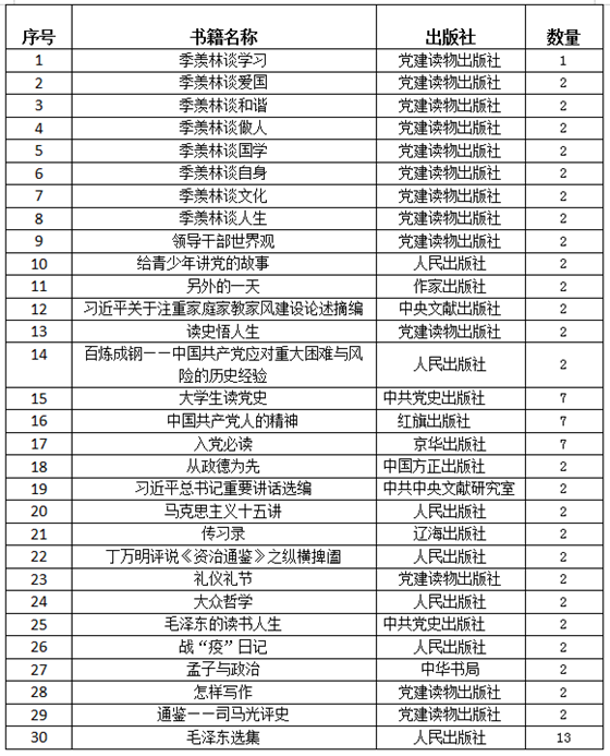 “落其实者思其树,饮其流者怀其源。”立足百年大党起点,感召红色奋进精神, 以“阅读新时代,奋进新征程”弘扬伟大党建精神为主题,图书馆整理出馆内30本图书,推荐给师生阅读,书单如下: