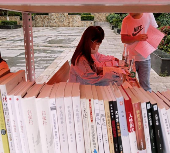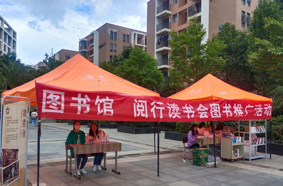 阅行读书会从图书馆挑选优质图书,把好书带出图书馆,带到同学们能够方便看到的地方,让好书主动走出去,走到校园中方便同学们借阅的地方。活动开始前,书会会员们积极搭建宣传场地,热情地参与到活动当中,他们成为阅读的使者,贡献着自己的力量。在活动开展中,路过的同学好奇地过来看发生了什么,在工作人员的讲解下,不少同学立刻兴致勃勃地在活动现场借阅图书。