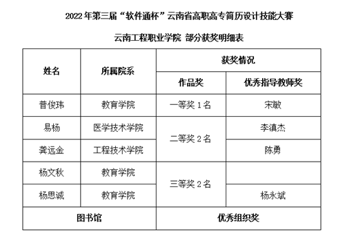 作者:图书馆 | 为进一步落实教育部发起的“以赛促教”全国性职业教育学生竞赛活动要求,落实立德树人根本任务,树立大赛引领教学的理念,鼓励师生参加技能大赛,激发学生学习动力,4月18日18:30,学校教务处、就业创业工作处在学校众创空间举行了2022年第三届“软件通杯”云南省高职高专简历设计技能大赛的颁奖仪式。