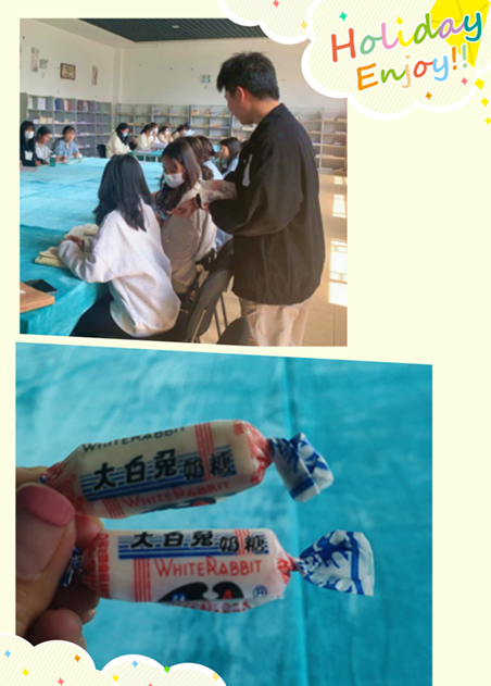 暖心的会长还给同学们带来了大白兔糖,他说:生活是甜的,希望大家每天都笑的甜甜的,虽然生活中也有苦,但也要偶尔给自己加颗糖,珍惜生活,好好生活,相信想要的都在来的路上!